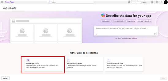 Schritt 5: Sobald Sie sich auf der  Seite Mit Daten starten befinden, wählen Sie in den Optionen  die Option Neue Tabellen erstellen  aus.