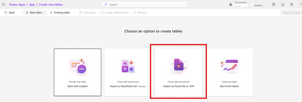Schritt 6: Wählen Sie auf der Seite „Neue Tabelle erstellen“ die Option Excel-Datei oder CSV importieren.