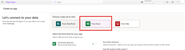 Schritt 6: Wählen Sie auf der  Seite App erstellen die Option „Aus Excel“, da wir unsere Tabelle aus der Excel-Datei importieren werden.