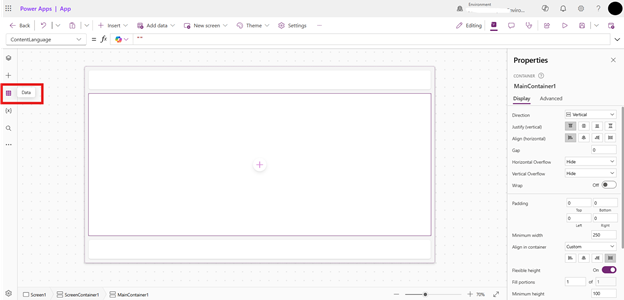 Schritt 6: Eine leere Canvas-App wird verfügbar sein. Um eine Verbindung zu Ihrer Datenquelle herzustellen, wählen Sie auf der linken Seite des Fensters „Daten“ aus.
